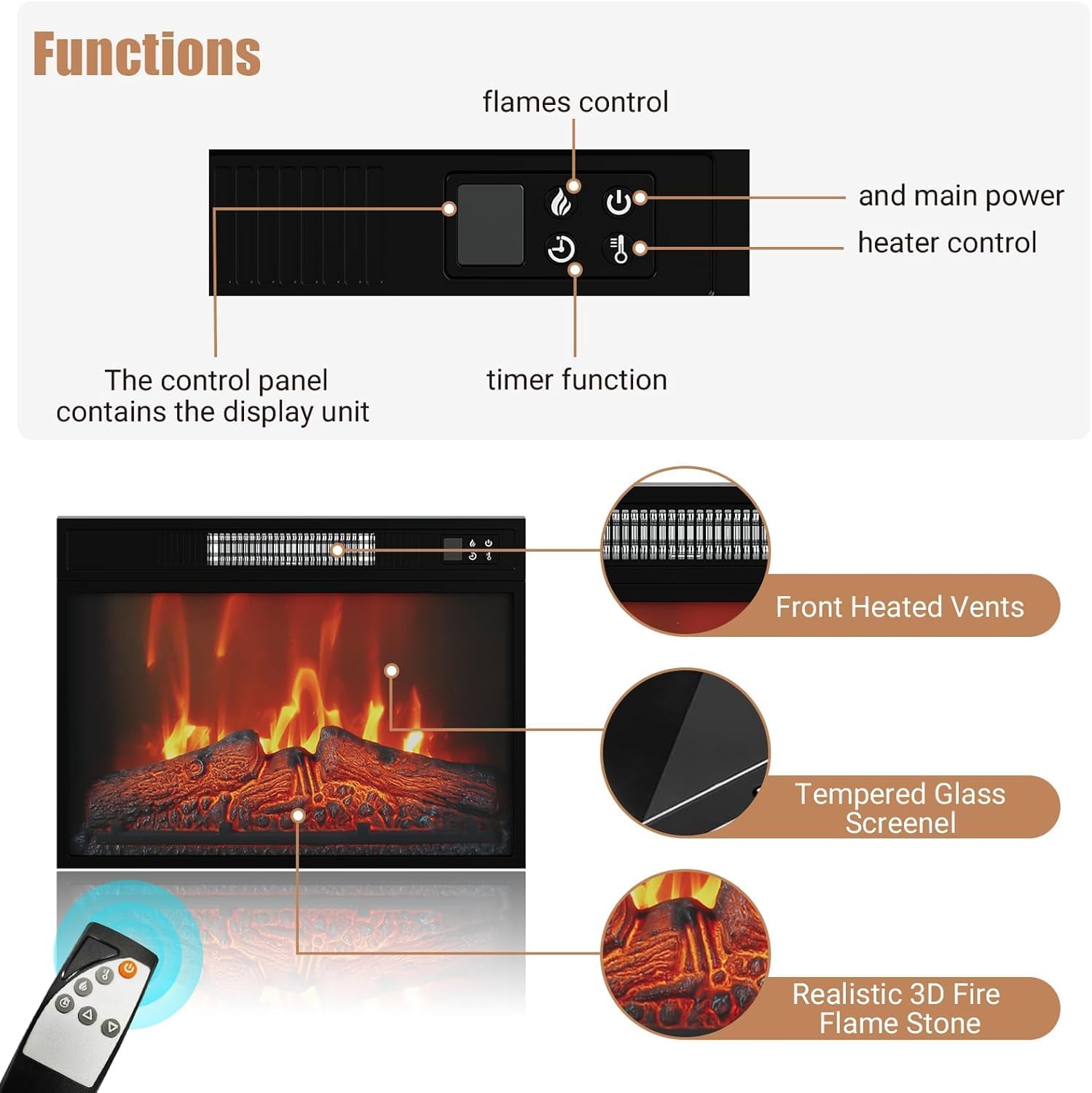 • Adjustable-Temperature Electric Fireplace:This tv stand with fireplace for 75 inch tv includes a 23-inch built-in electric fireplace, easily controlled with a remote. The fireplace offers three flame brightness levels and an adjustable temperature range from 72°F to 82°F. It also features a timer function, allowing you to set it from 0.5 to 6 hours. The fireplace is made of durable iron and glass, and meets CSA, CE, ERP, and RoHS certifications for safety and quality.