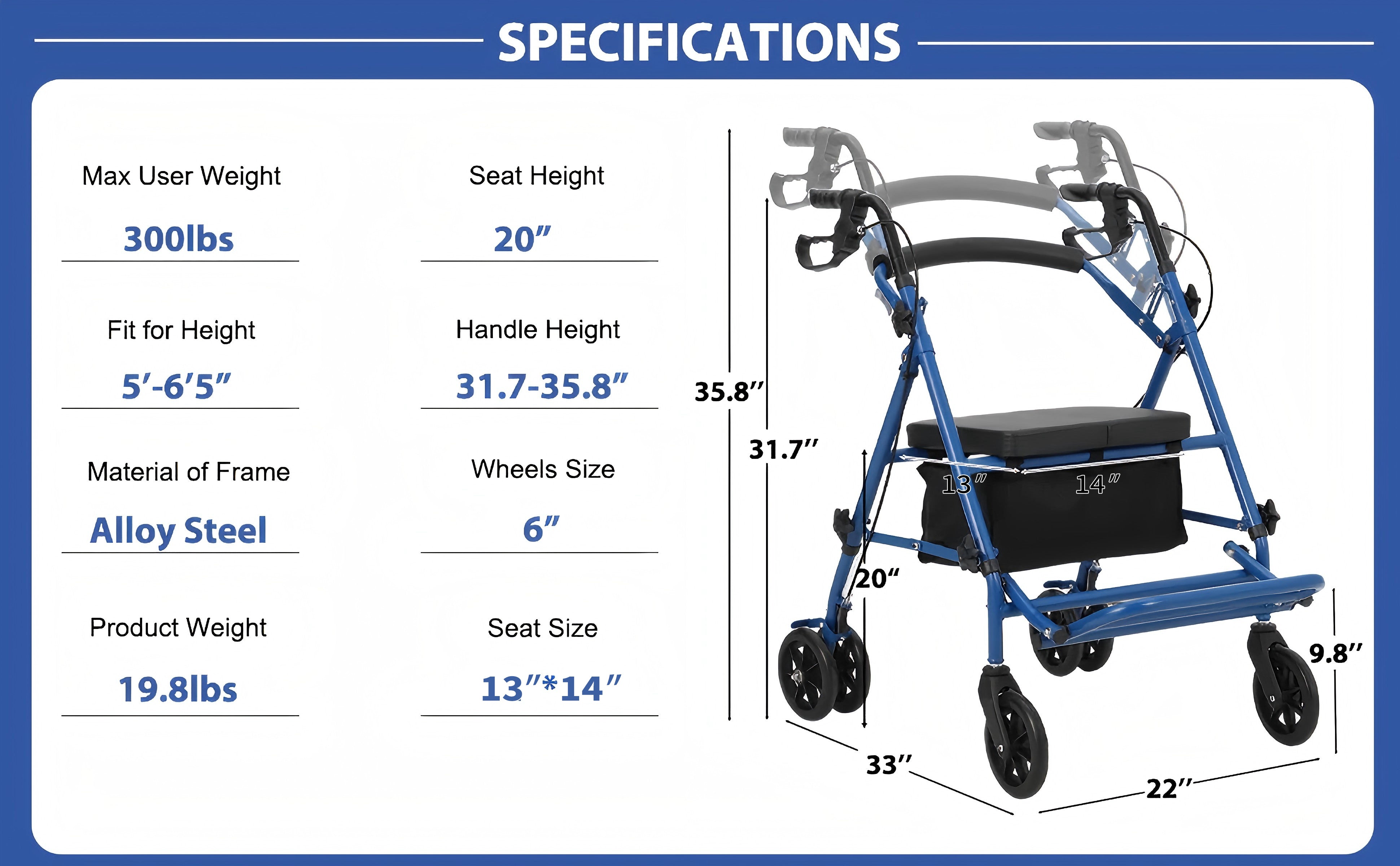 - Comfort Details: Our rollator walker comes with padded seats and backrests to ensure a comfortable and safe rest. We also offer storage bag to keep all your important items within easy reach, freeing up your hands!