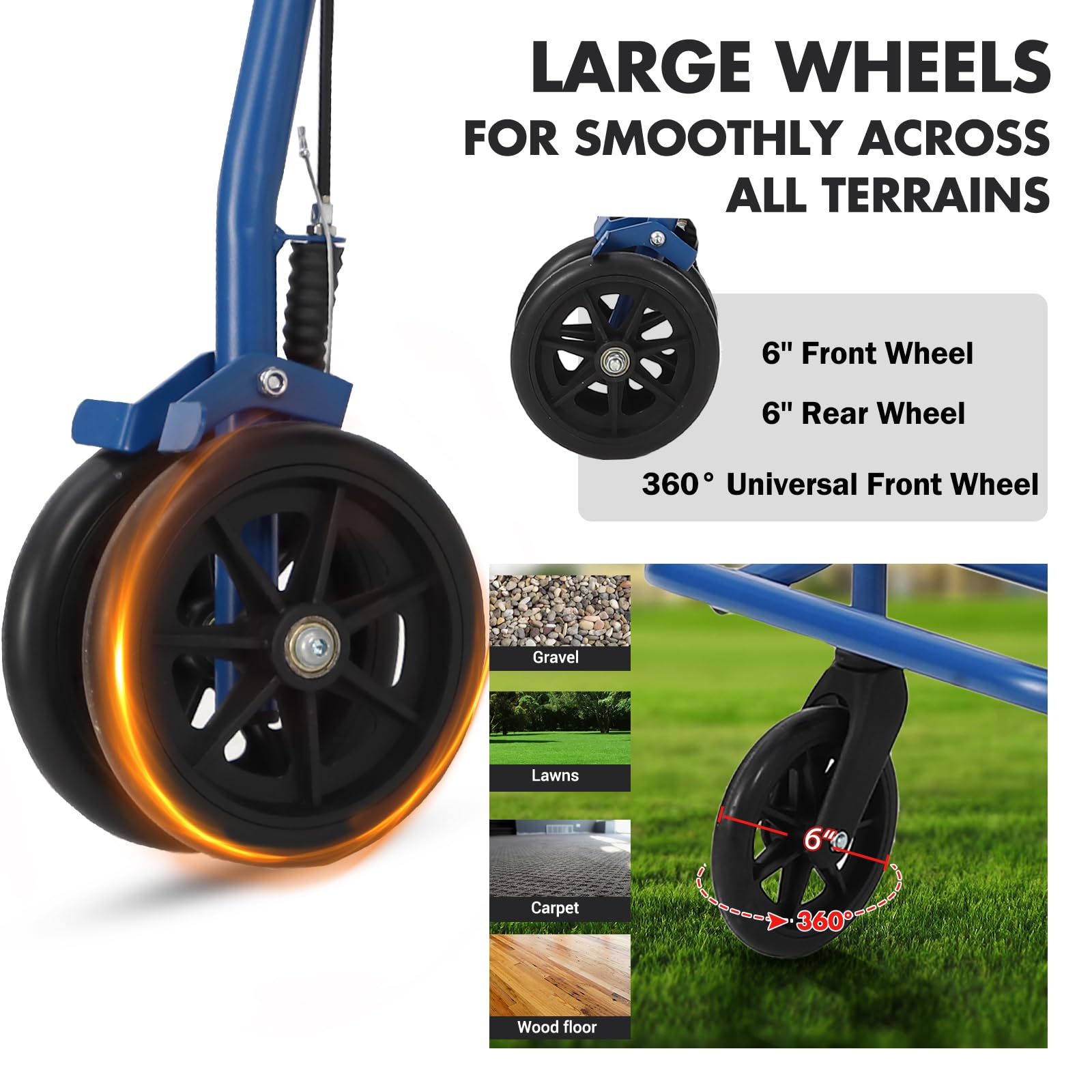 - Perfect Outdoor Rollator Walkers: 6-inch solid explosion-proof tires, 360° rotation, non-slip, wear-resistant, with good shock absorption, easy to maneuver on grass, gravel, dirt and gaps in sidewalks.