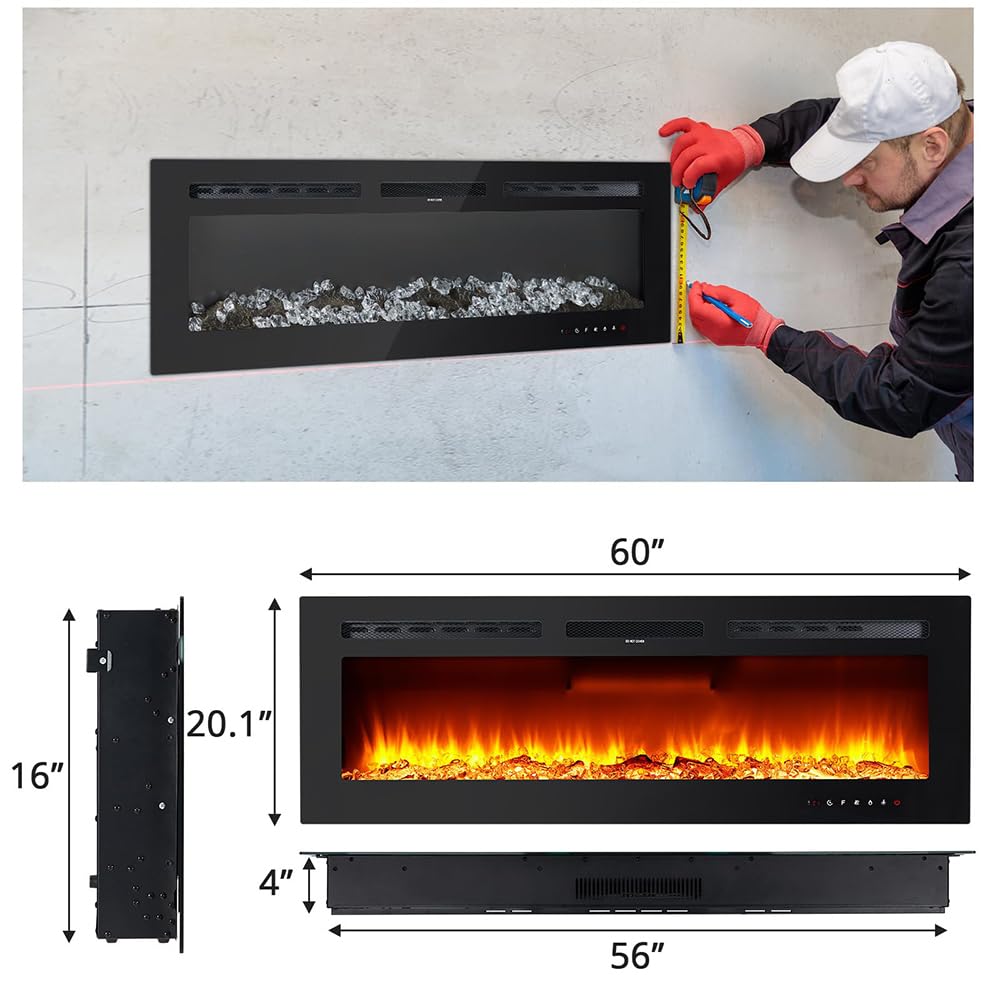 Garvee 60″ Electric Fireplace In-Wall Recessed & Wall Mounted, Remote Control, 12 Flame Colors, 750/1500W Heater, Timer, Adjustable Brightness, Log & Crystals