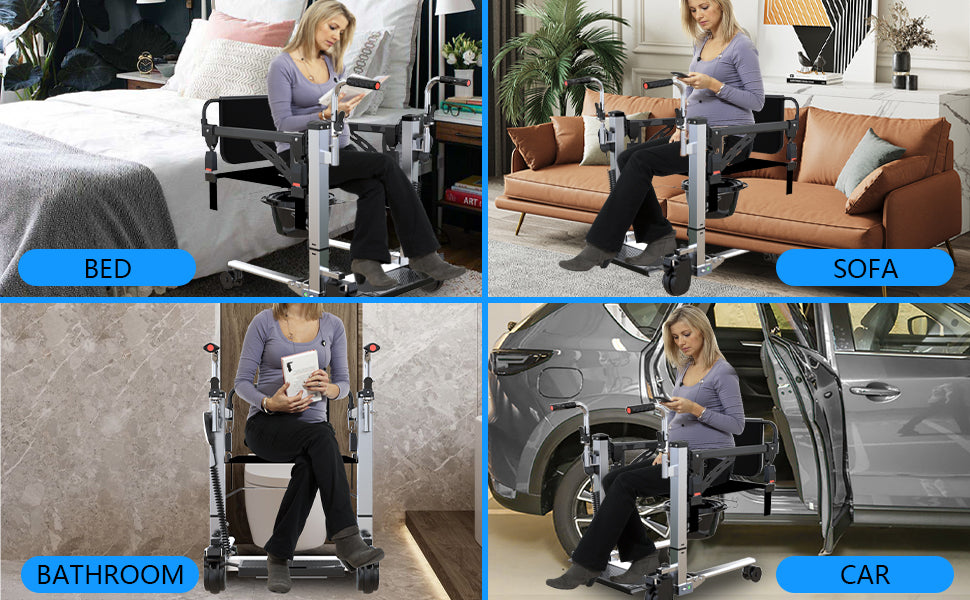 - Multiple Functions: This versatile elderly lift transfer chair with swivel seat and bedpan serves as a 4-in-1 solution: shower chair, wheelchair, commode chair, and regular sofa chair. Perfect for home healthcare, elderly care, and even for travel with its easy disassembly.