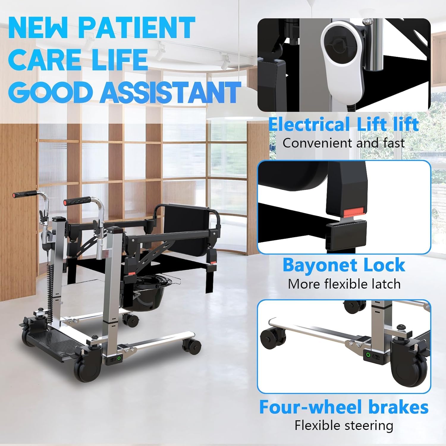 - Safe and Stable: Our Electric patient lift transfer chair features a robust, heavy-duty steel frame, ensuring maximum safety and stability during transfers. With a high-strength carbon steel pipe construction, it’s waterproof, corrosion-resistant, and supports up to 220lbs.