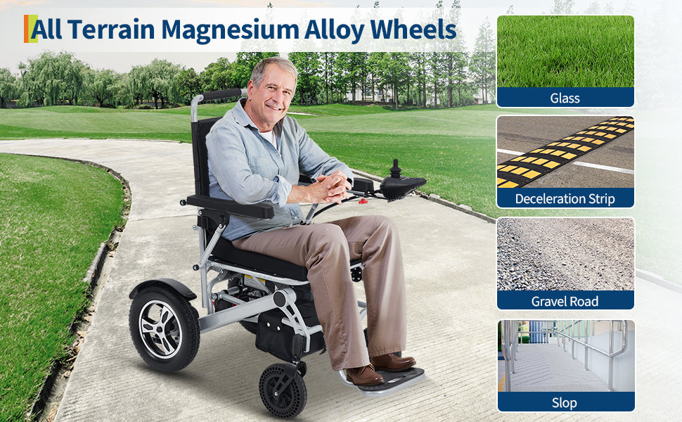 - 【All-Terrain Magnesium Alloy Wheels】: Equipped with puncture-proof solid tires and durable magnesium alloy hubs, it maintains a stable and smooth riding experience whether traveling on grass, gravel roads, speed bumps or muddy roads.