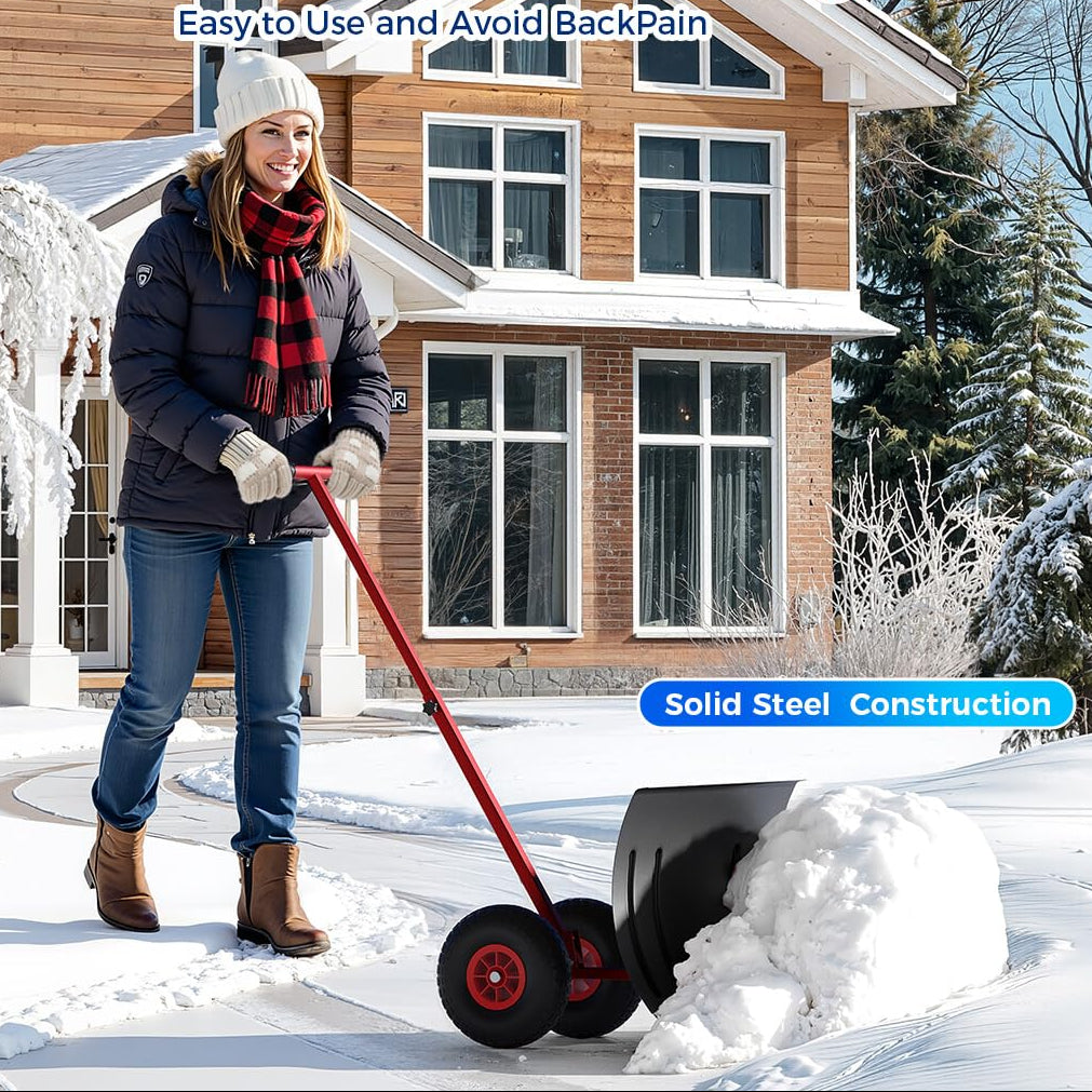 Garvee Heavy-Duty Snow Pusher with Wheels 30in Wide Blade 5-Position Adjustable Handle Steel Frame Anti-Slip Wheels Driveway Sidewalk