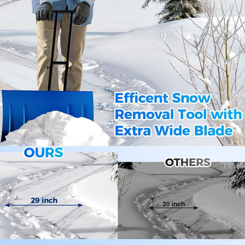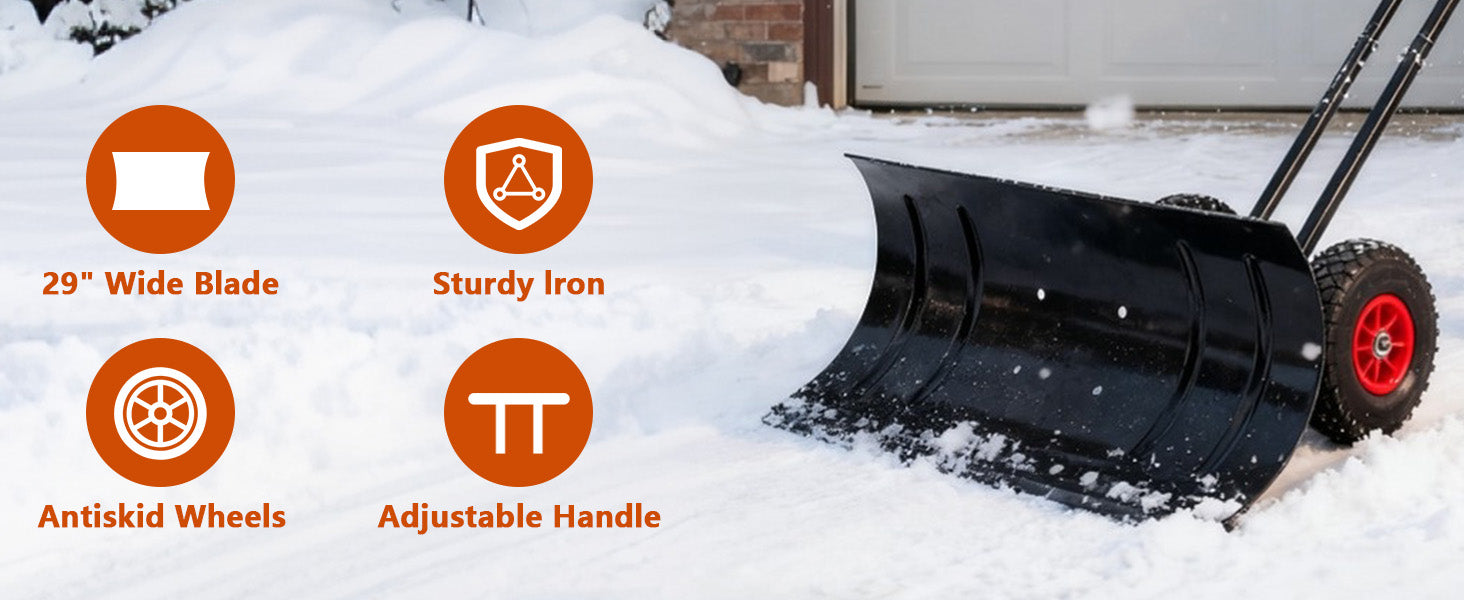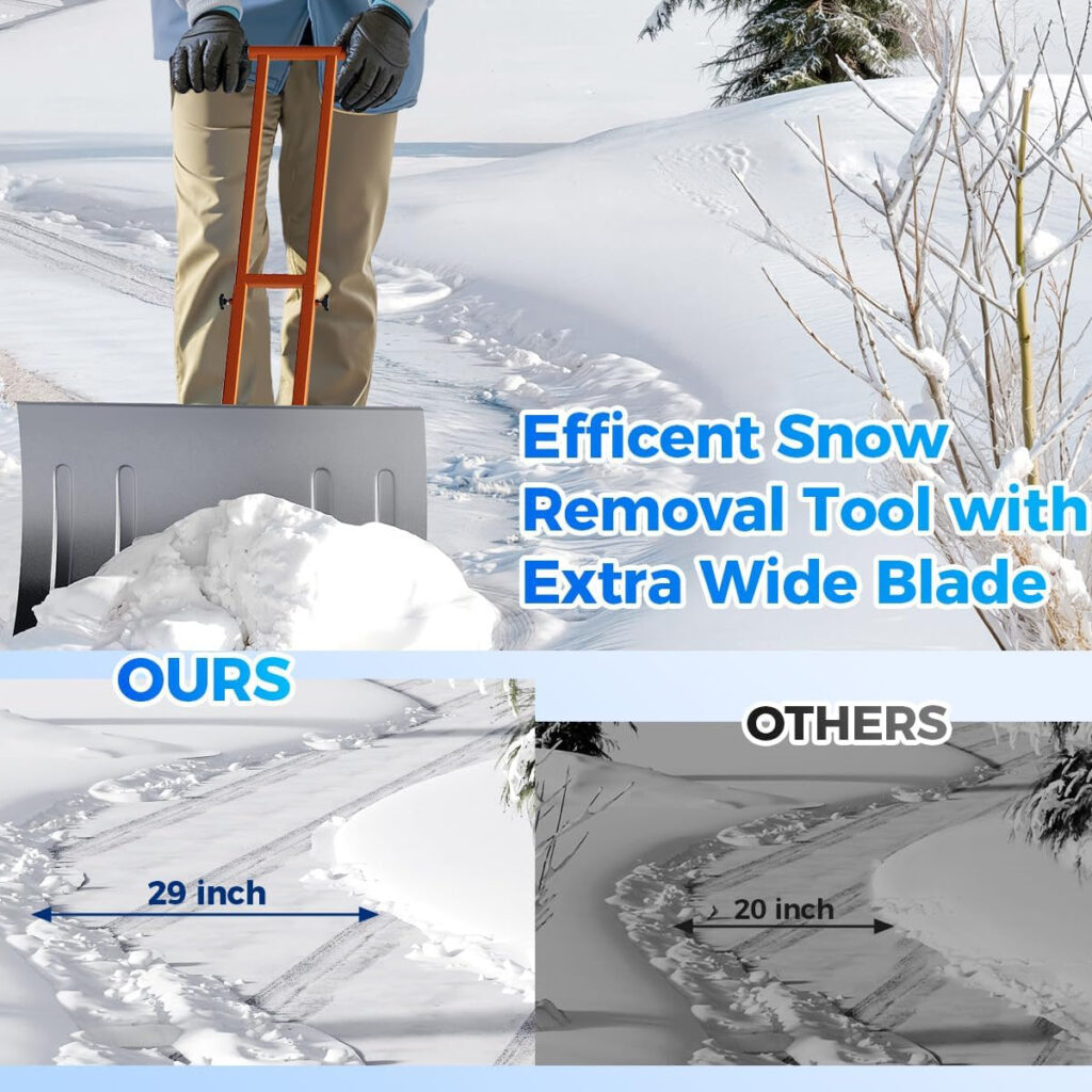 Garvee Snow Shovel 29″W X 14.2″H with 7-Position Angled Blade & Adjustable Handle, Heavy Duty Metal Snow Pusher Shovel with Wheels for Driveway, Doorway, Sidewalk, Pavement