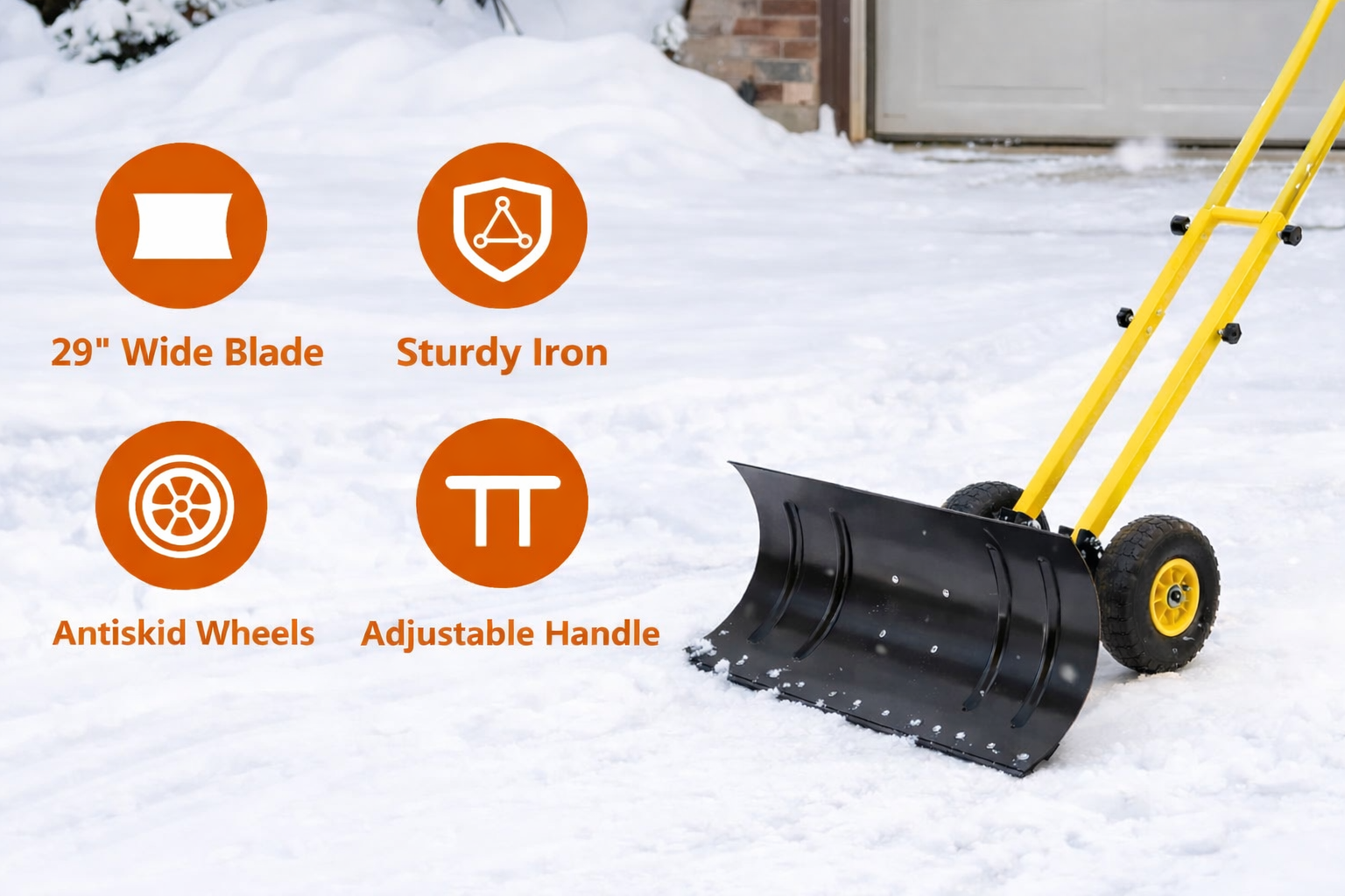 Garvee 29″W X 19.8″H Snow Shovel with Wheels Carbon Steel 29″ Metal Blade Adjustable Handle & Angles Double Rod Design Anti-Slip Grip for Driveways Sidewalks Yards