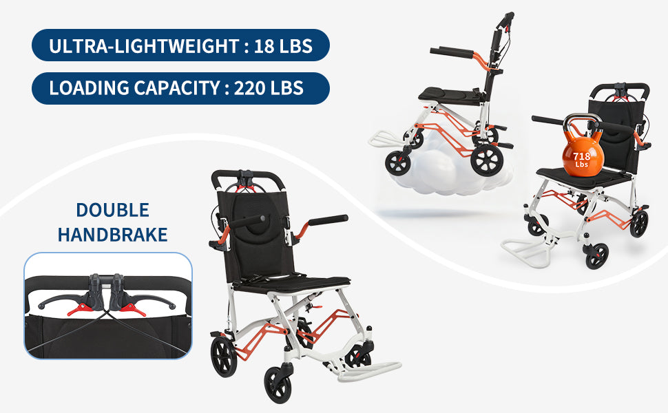 Garvee Ultra Lightweight 18 lbs Transport Wheelchair, Portable Folding Chair with Locking Handbrake, Removable Flip-Back Armrests & Swing-Away Footrests, Supports 220 lbs