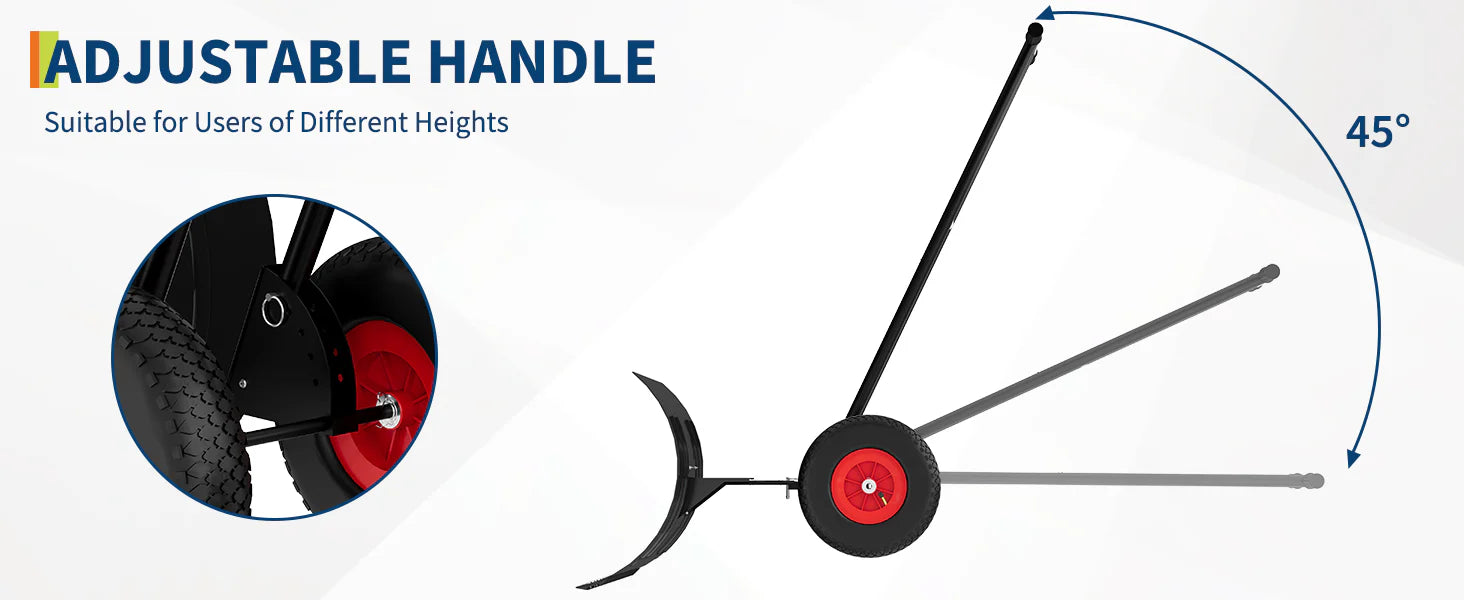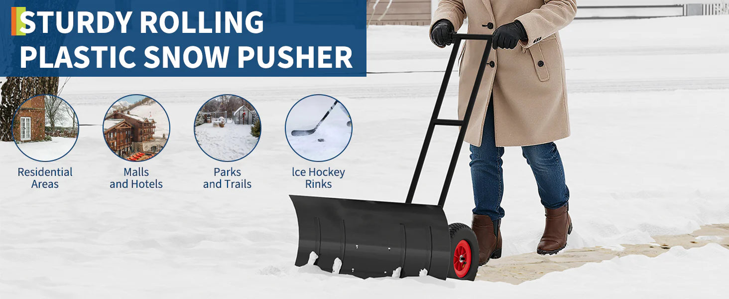 Garvee 29.5″ x 13.8″ Heavy-Duty Wheeled Snow Pusher Shovel – Adjustable Handle Height & Blade Angle for Effortless Driveway & Pavement Snow Removal