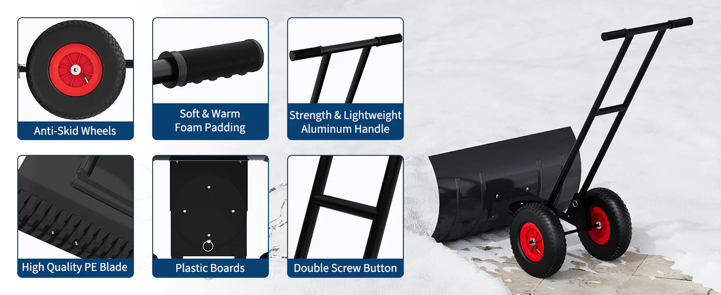 Garvee 29.5″ x 13.8″ Heavy-Duty Wheeled Snow Pusher Shovel – Adjustable Handle Height & Blade Angle for Effortless Driveway & Pavement Snow Removal